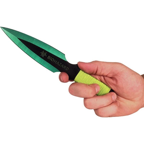 2 Piece Throwing Knife BioHazard. 9" Length, 2 Piece Set, made from 440 stainless steel, great beginner to intermediate throwing knife. Includes sheath pouch for knives.